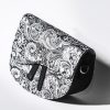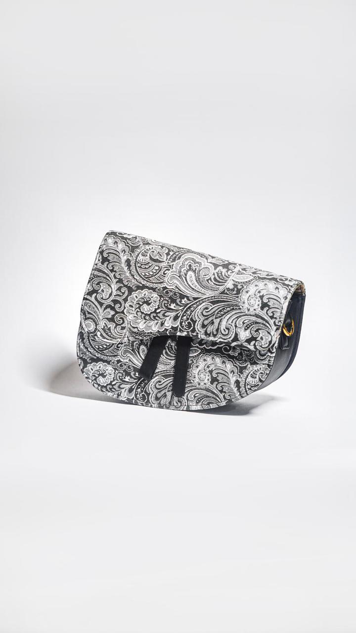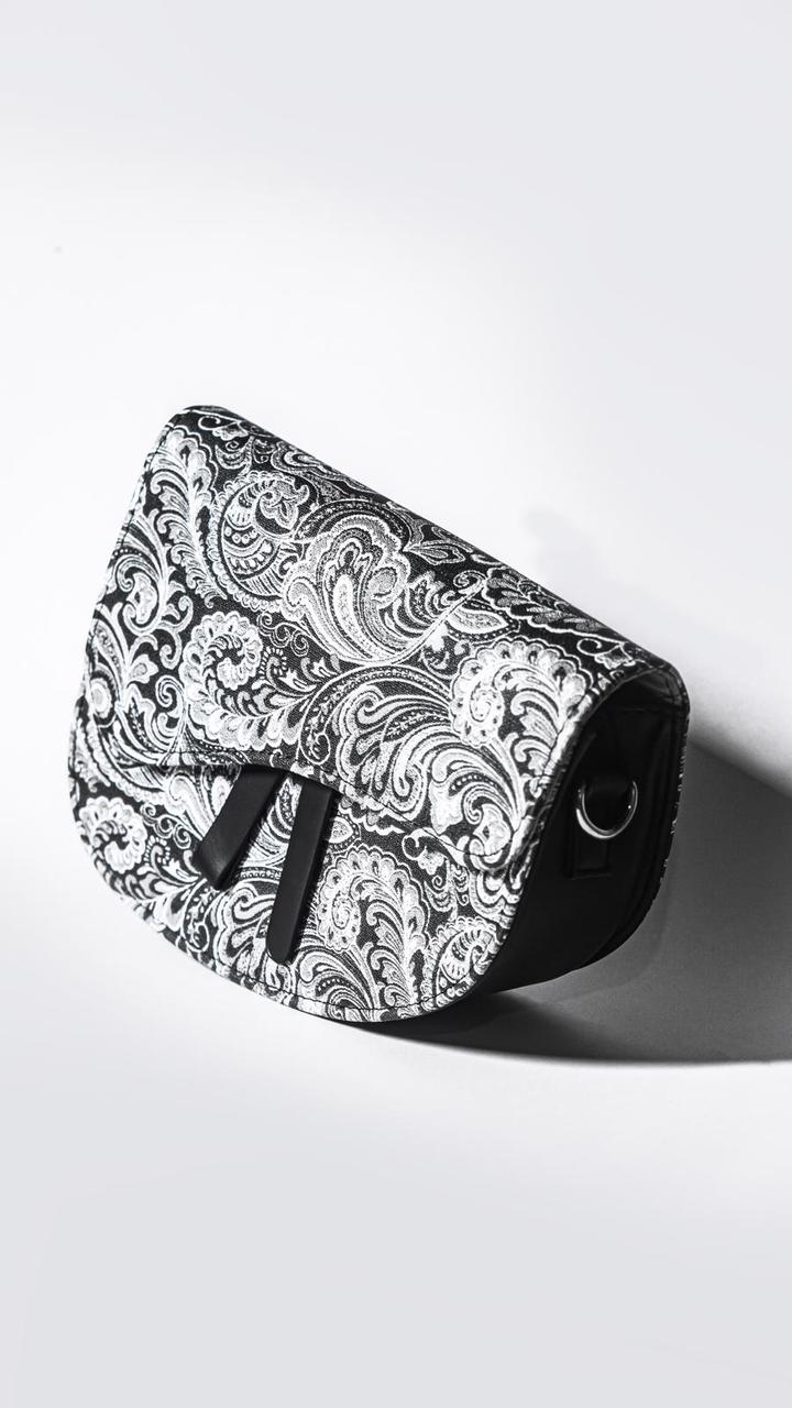 Elevate your style with this unique Paisley Print Saddle Bag. The striking black-and-white paisley pattern on the main body gives this bag a classic yet bold aesthetic. Featuring a smooth, solid black flap and a chic half-moon silhouette, this accessory offers both eye-catching design and practicality for your everyday essentials. It’s the perfect statement piece to complement any outfit, from casual to chic.