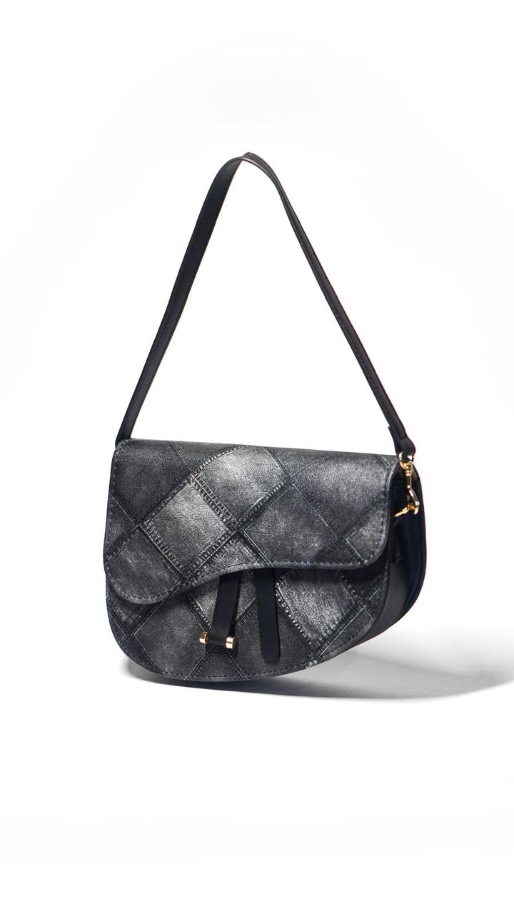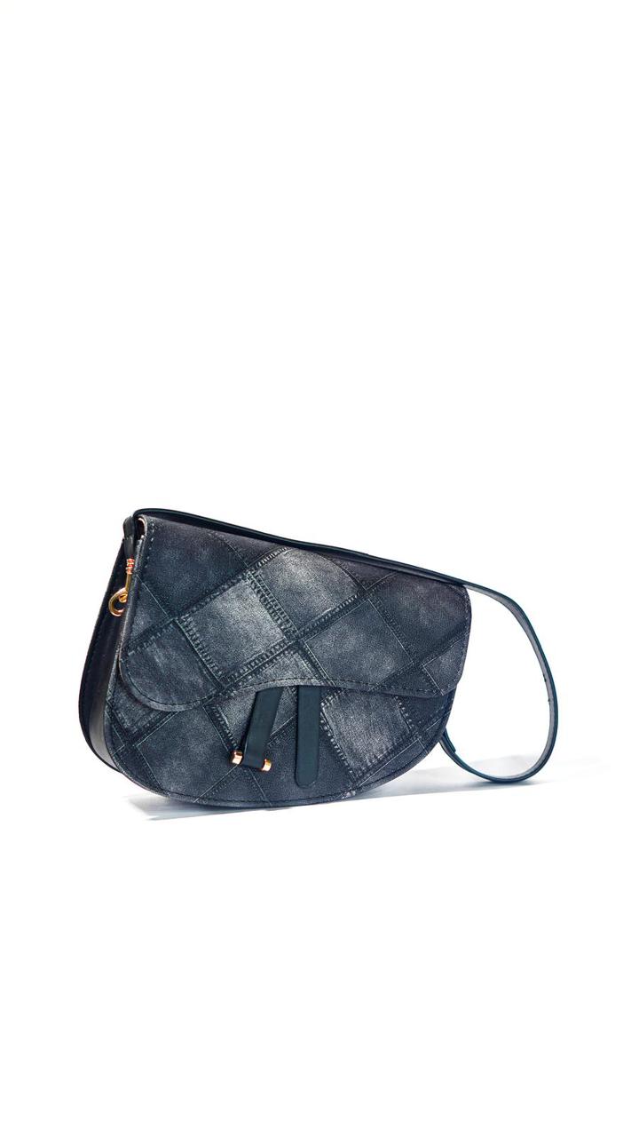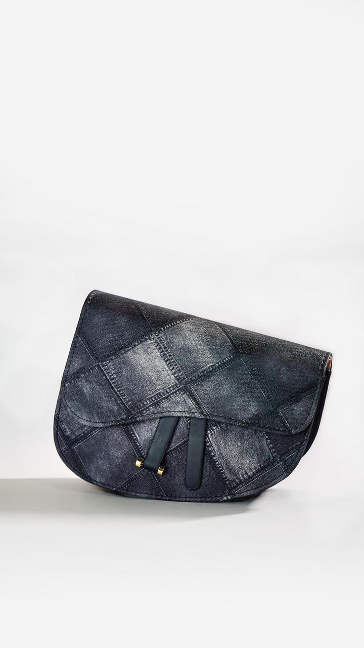 This distinctive saddle bag offers a fresh take on a classic silhouette. The unique diamond-quilted pattern on the dark, denim-style material gives it a textured, sophisticated look. Complete with a stylish flap and a sleek crossbody strap, this bag is a versatile statement piece that effortlessly combines rugged charm with modern design.