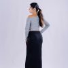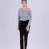 * Neckline: Asymmetrical, off-shoulder/boat neck style
